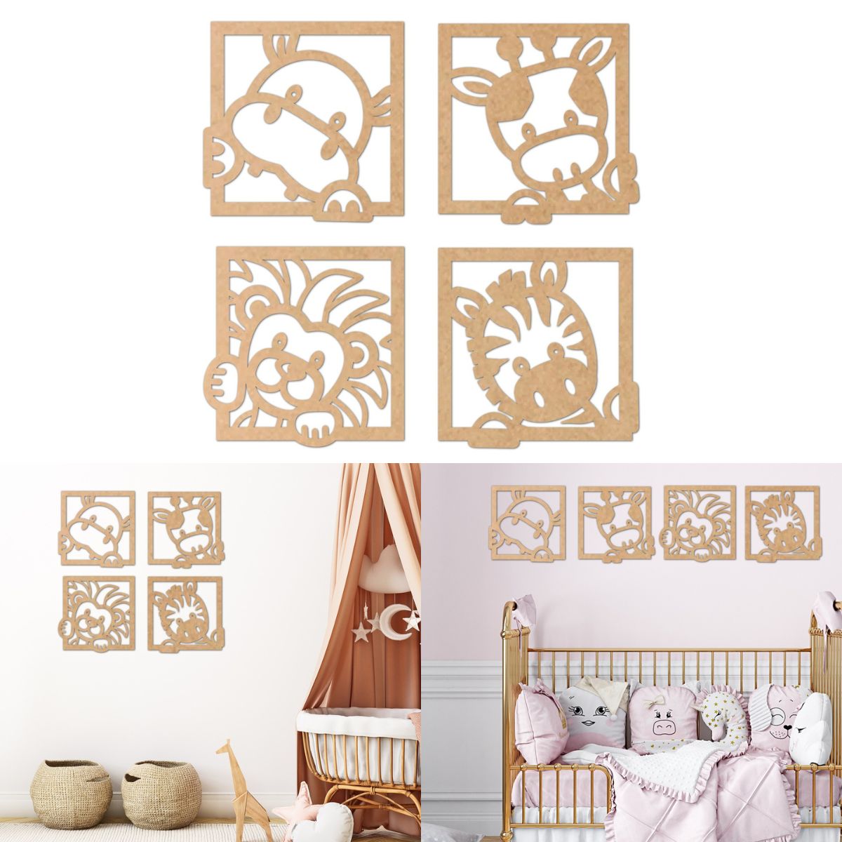 Que tal transformar o quarto do seu filho ou filha em uma aventura no safari? Com os quadrinhos decorativos para quarto infantil com tema de safari, você pode criar um ambiente divertido, lúdico e educativo para a criança. Os quadrinhos são feitos em MDF 3mm que é um material resistente e leve, além de ser ecológico e trazem ilustrações de animais mais populares e queridos pelas crianças como hipopótamo, leão, girafa e zebra. Além de decorar, os quadrinhos estimulam a imaginação e o conhecimento dos pequenos sobre a fauna africana.