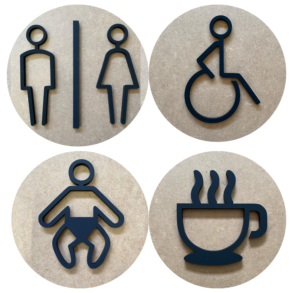 Kit Placa Indicativa Sinalização Banheiro Sanitário H,M/Unissex, Banheiro Acessível Cadeirante PCD, Fraldário Trocador / Banheiro Familiar, Café/Copa
