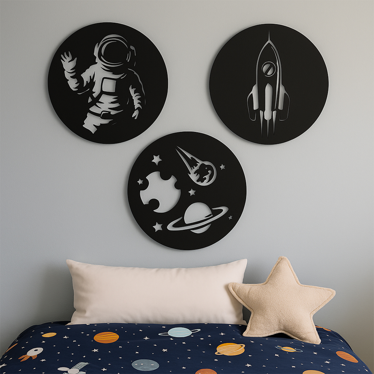 O Conjunto de Quadrinhos Decorativos Infantil com tema de espaço é uma maneira encantadora, educativa e criativa de transformar o quarto do seu pequeno. Composto por três peças exclusivas, os apliques trazem cenas fantásticas do universo, como astronautas, foguetes, planetas e a lua. Fabricados em MDF de 3mm, eles são leves, ecológicos e resistentes, ideais para quem valoriza sustentabilidade e qualidade.